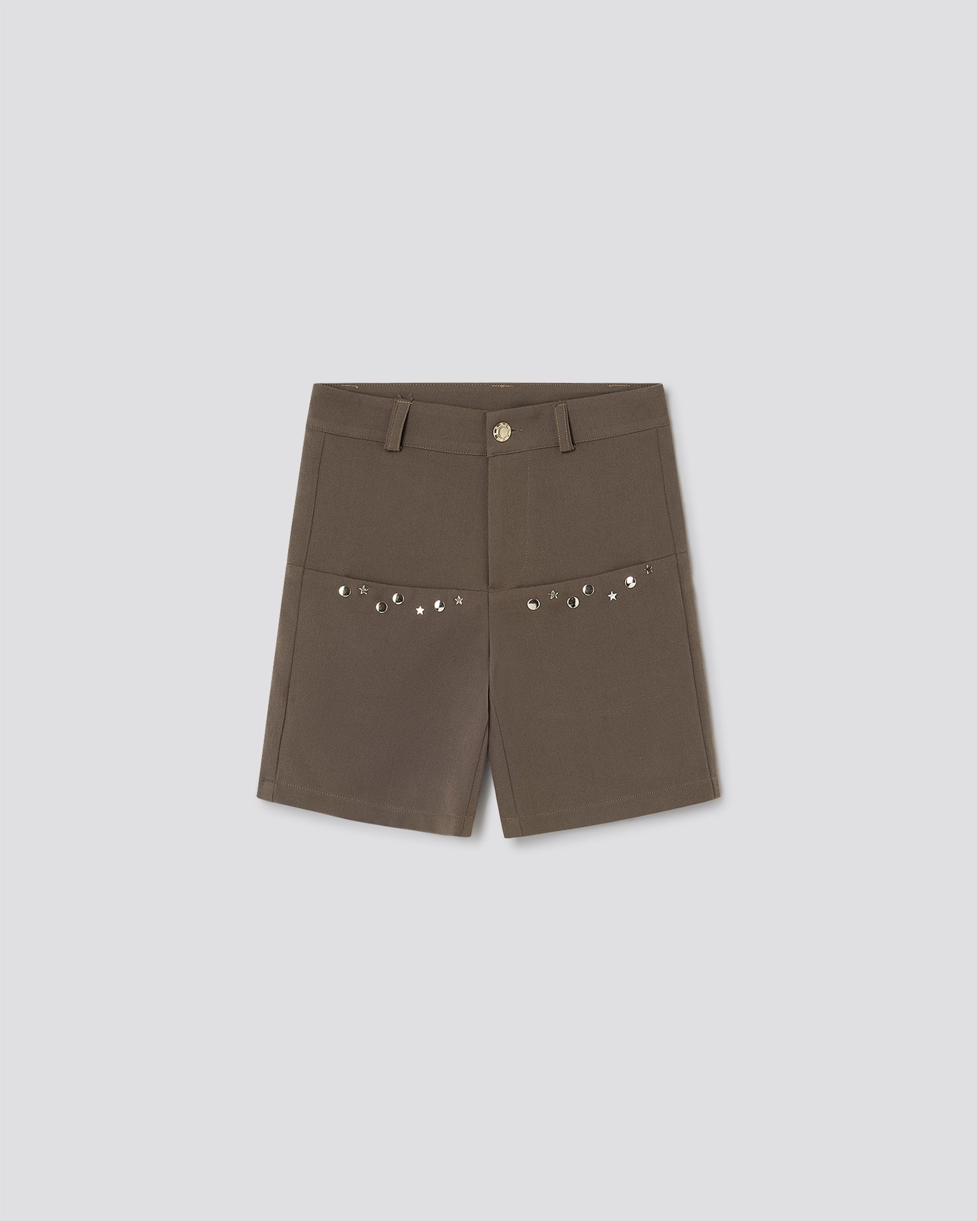 Cotton shorts with front pockets with aged silver studs details. Front button fastening, front zipper fastening and oversized fit.