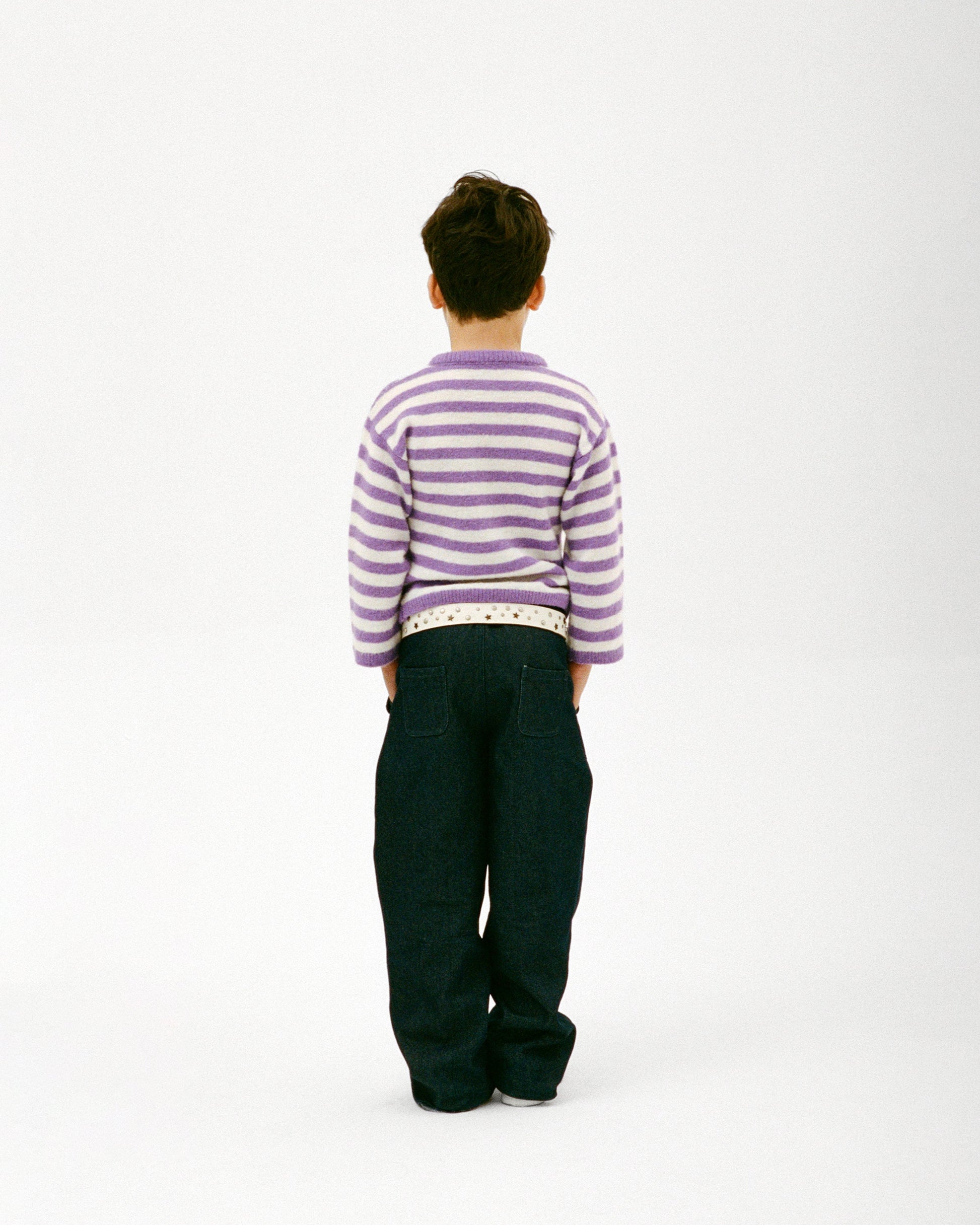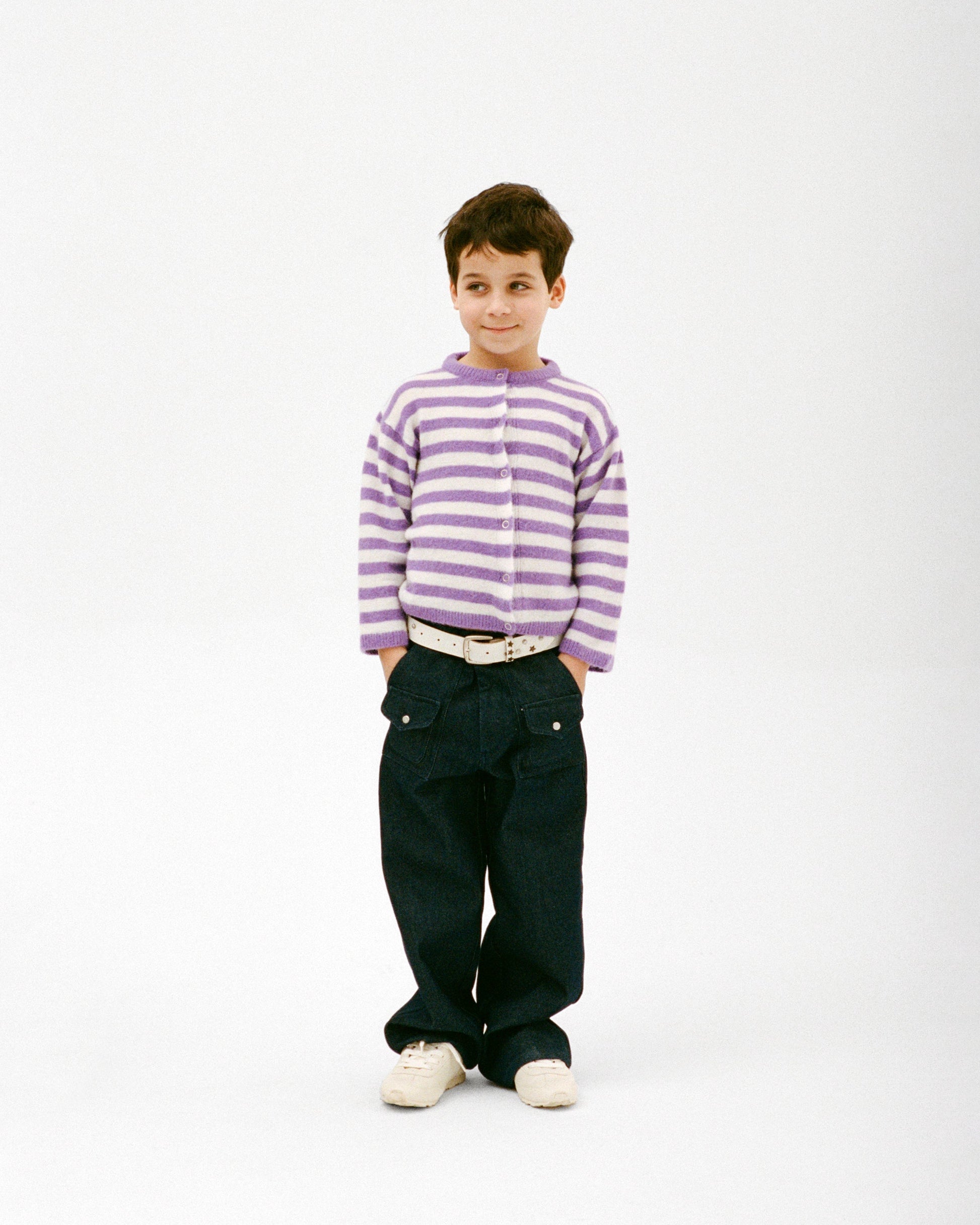 Striped purple and white cardigan with fake metallic snaps buttons. Designed with long sleeves, loose fit and ribbed neck. Made in Spain. Unisex jumper.